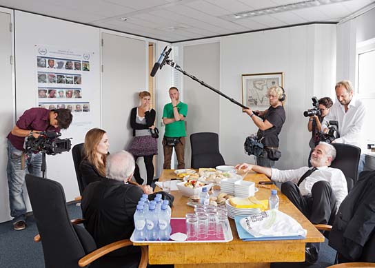 Michele Gentile (on the left), Angelina Jolie (second on the left), Luis Moreno-Ocampo (front, right), Marcus Vetter (on the right) on the set of "The International Criminal Court" (2012/13)