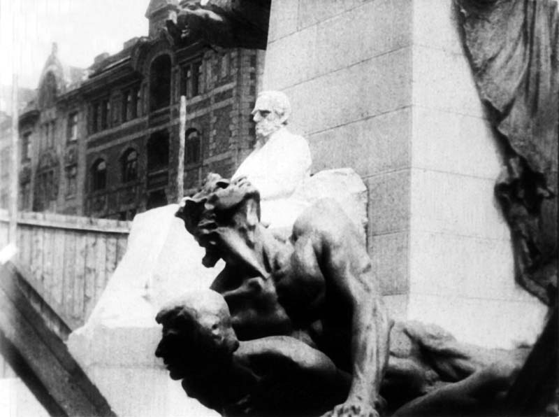 Descrição: bottom part of the monument with the statue in sitting position of František Palacký in the background