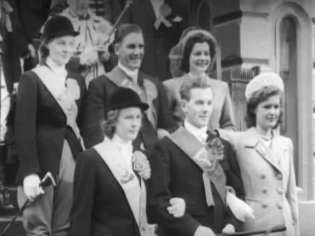 Investiture of the Cornet, shots of the crowds, the horse race and procession of horsemen through the "city gates", Dumfries. Part of the celebrations for Guid Nychburris Day, 1949.