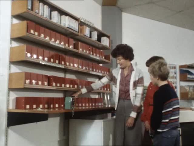 A boy and a girl visit a library; the librarian shows them services available in the library and how to use the catalogue to find a particular book.
