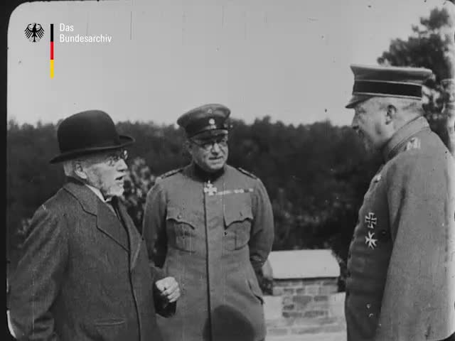 Reich Chancellor Georg Count von Hertling arrives at Imperial Headquarters in Bad Kreuznach with a column of cars; briefing with staff officers in the open air; a walk and departure in the car.