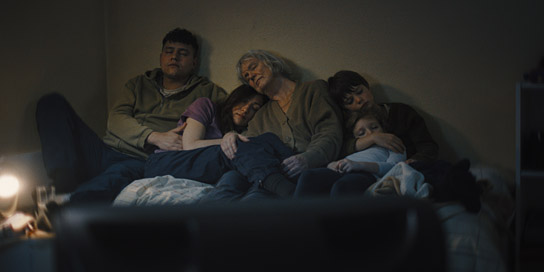 Justus von Dohnányi, Jona Volkmann, Janina Uhse, Caroline Peters, Christoph Maria Herbst, Kya-Celina Barucki (left to right), Florian David Fitz (from behind) in "Der Spitzname" (2024)